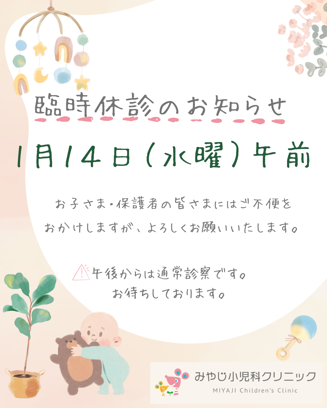 1月14日(水)午前は、臨時休診とさせていただきます。